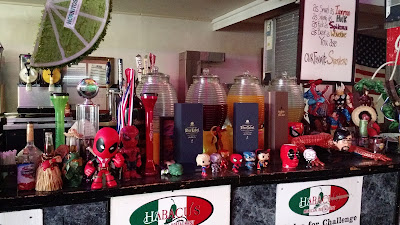 The bar was decorated with Marvel superheroes. Deadpool, Captain America, and Iron Man stared out from between the Johnny Walker Blue and the giant jars of flavored margaritas. The salsa was excellent and so were the tacos de calle - soft corn tortillas filled with spicy pork and pineapple.